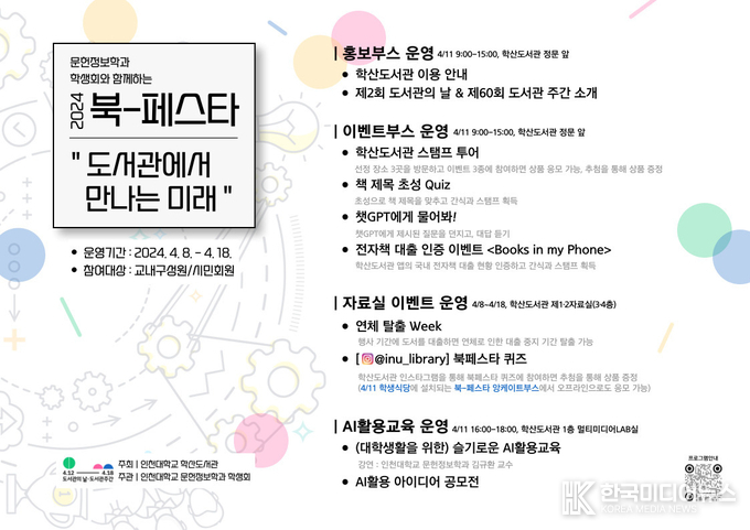 이번 2024 북-페스타는 제2회 도서관의 날(4/12) 및 제60회 도서관 주간(4/12~4/18)을 맞이하여 진행되는 행사로, 인천대 구성원 및 학산도서관 시민회원 누구나 참여할 수 있다. ▲학산도서관 이용 방법과 도서관의 날에 대해 안내하는 홍보 부스 운영 ▲도서관 스탬프 투어 등 다양한 이벤트에 참여할 수 있는 이벤트 부스 운영 ▲연체탈출위크 등의 자료실 이벤트 운영 ▲대학생활을 위한 슬기로운 AI활용교육 등 다채로운 독서문화행사가 진행될 예정이다.