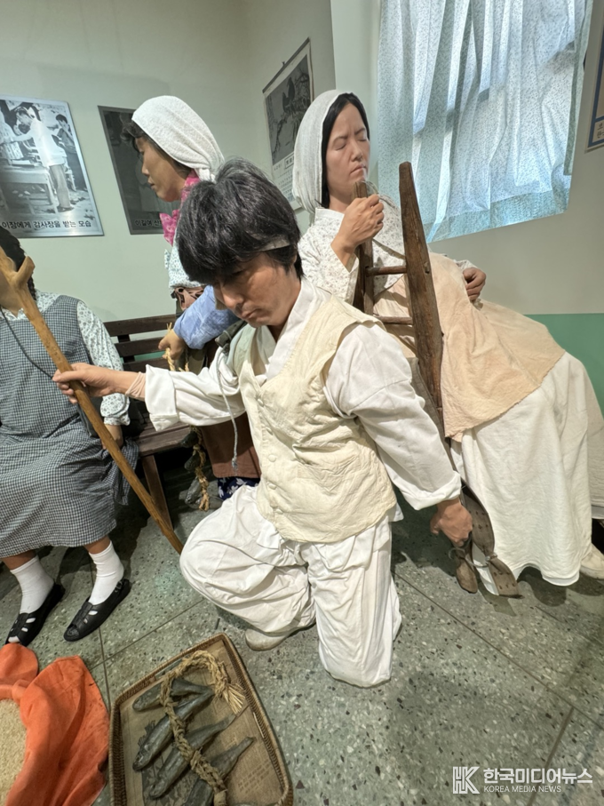 아픈 아내를 지게에 짊어지고 온 남편의 모습이 인상적이다. 기념관 1층에는 마치 말을 건넬 것처럼 생동감 있는 밀랍인형이 전시되어 있다.
