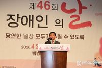 [한국미디어뉴스 양선희 기자 ] (사)국제장애인문화교류 인천광역시협회(협회장 서성식)는 18일 오후 1시 들풀 라이브 쉼터에서 미추홀예술봉사단과 사랑•나눔 봉사협회와 함께 제46회 장애인의 날 기념식을 열었다. 기념식에는 박찬영 연합기독교 목사, 전용호 남동구의회 예결 부위원장, 한상현 아름다운 손 대표, 장애인 복지 유공자와 가족, 장애인 단체 관계자 등 초청된 200여 명이 참석했다. 이번 행사 슬로건인 "당연한 일상, 모두가 누릴 수 있도록"은 장애인을 복지의 수혜자가 아니라 권리의 주체로 인식하는 전환과 장애인과 비장애인이 성숙한 시민의식을 통해 사회통합을 이루려는 장애인 정책 방향을 반영했다. 기념식은 김정하 사회자의 개회 선언으로 시작됐고, 이어 지체장애인인 윤인숙 씨가 장애인 인권 헌장을 낭독했다. 이 헌장은 장애인의 인권 및 평등을 확인하고, 더불어 살아가는 사회를 위한 국가와 사회의 책임을 명시하기 위해 제정됐다. 헌장은 차별받지 않을 권리와 인간다운 삶을 영위할 권리 등 13개 항목으로 구성돼 있다. 수상식에서는 장애 극복과 장애인 복지 증진에 기여한 유공자에게 인천시의회의장 표창 2명, 인천시 교육감 표창 2명, 구청장 표창 2명, 국회의