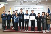 [ 한국미디어뉴스 이보영 기자 ] 안양시는 전국공무원노동조합 안양시지부와 7년 만에 단체협약을 체결했다. 안양시는 8일 오후 시청 3층 접견실에서 최대호 안양시장, 현서광 안양시지부장 등 노사 양측 관계자 11명이 참석한 가운데 ‘2026년 단체협약’ 체결식을 열었다. 이번 단체협약에는 ▲악성민원 피해 조합원 보호 ▲소송 변호 비용 지원 ▲교육비 단계적 인상 ▲육아시간 사용자의 대직자 인센티브 등 직원 권익 보호와 근무환경, 복지・교육 향상을 위한 내용이 담겼다. 이번 단체협약은 지난 2019년 5월 이후 약 7년 만에 체결된 것으로, 2004년 출범한 노조는 2008년 첫 단체협약 체결 이후 2019년 두 번째 협약을 체결했다. 이번 단체교섭은 지난해 8월 노조의 요구로 시작돼 약 7개월간 부서 검토와 실무교섭 등을 거쳐 최종 합의에 이르렀다. 현서광 노조 지부장은 “이번 협약은 우리 지부의 노력과 단합의 결과”라며 “조합원, 비조합원분들도 노조와 함께해 더 나은 근로환경을 만들기 위해 한 걸음씩 꾸준히 전진해 나가겠다”고 밝혔다. 최대호 안양시장은 “노사 양측의 입장차