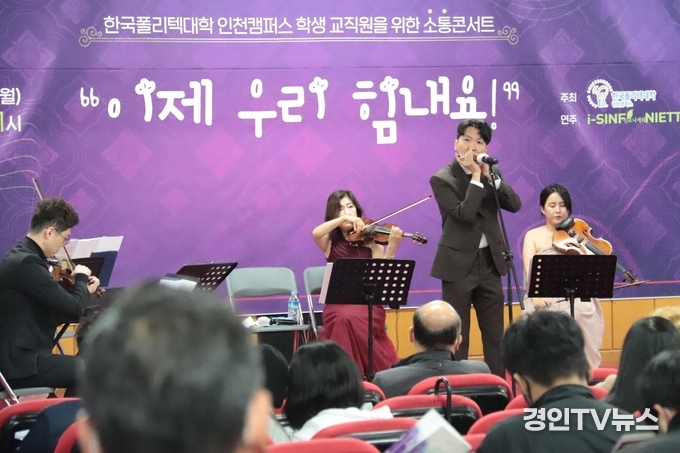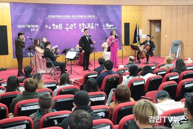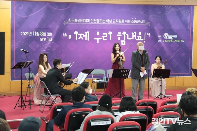 [ 경인TV뉴스 김선근 기자 ] 한국폴리텍대학 인천캠퍼스(학장 이상호) 는 8일 오후, 인천지역 실내악단 ‘ I-신포니에타’ 를 초청하여 재학생 및 교직원을 위한 소통 콘서트를 개최했다.
