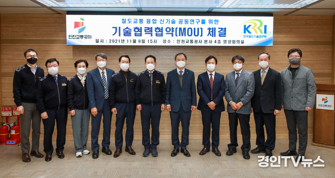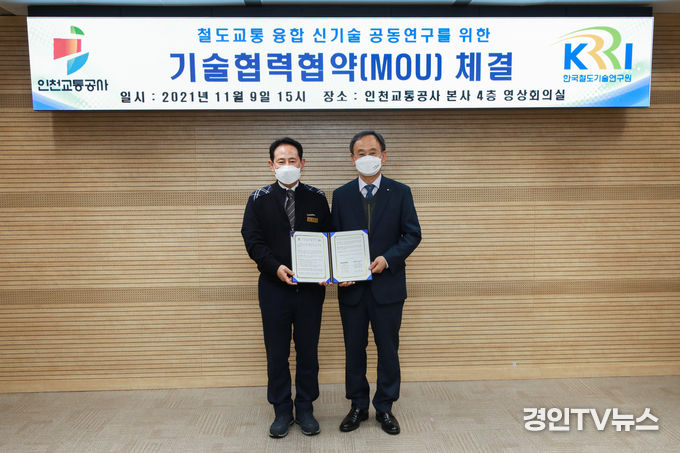 [ 경인TV뉴스 김선근 기자 ] 인천교통공사(사장 정희윤)는 9일 한국철도기술연구원과 상호기술협력 및 공동연구를 주요 내용으로 하는 업무협약을 체결했다고 밝혔다.