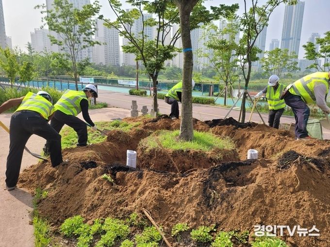 [ 경인TV뉴스 김선근 기자 ] 인천경제자유구역(IFEZ) 청라국제도시 청라호수공원의 수목 생육 환경 개선 사업이 순조롭게 진행되고 있다.
