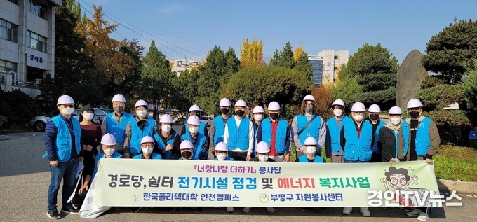 [ 경인TV뉴 김선근 기자 } 한국폴리텍대학 인천캠퍼스(학장 이상호) ‘너랑나랑 더하기 봉사단’은 지난 6일 오후 , 부평구 자원봉사센터와 LED 전등교체 및 전기시설 안전점검 봉사활동을 실시했다.