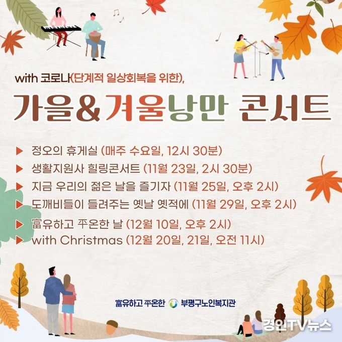 [ 경인TV뉴스 김선근 기자 ] 인천 부평구 노인복지관(관장:최민수)은 With 코로나(단계적 일상회복)을 위한‘가을 & 겨울 낭만 콘서트’를 개최하여 사회적 거리두기로 문화예술 향유를 못했던 어르신들에게 다채로운 공연을 제공하기로 했다고 밝혔다.