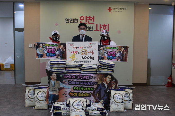 [ 경인TV뉴스 김선근 기자 ] 대한적십자사 인천지사(회장 김창남)는 장민호 팬카페인 ‘인천사슴사랑민트’가 인천 관내 취약계층 지원을 위한 쌀 500kg을 기부했다고 16일 밝혔다.