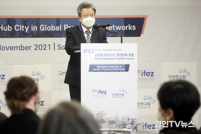 인천경제자유구역청은 17일 송도컨벤시아에서 온·오프라인으로 ‘글로벌 생산 네트워크와 혁신거점 도시(Innovation Hub City in Global Production Networks)’를 주제로 한 ‘2021 글로벌 비즈니스 프런티어 포럼’이 열렸다고 밝혔다.