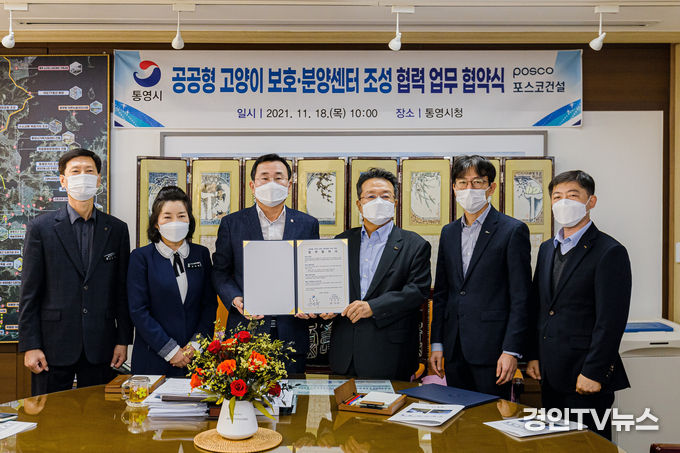 포스코건설은 18일 통영시와 용호도에 위치한 한산초등학교 용호분교장을 리모델링하여 고양이 보호 분양 시설을 운영하기 위한 협약식을 맺었다. 이날 행사에는 포스코건설 한성희 사장과 통영시 강석주 시장이 참석했다.