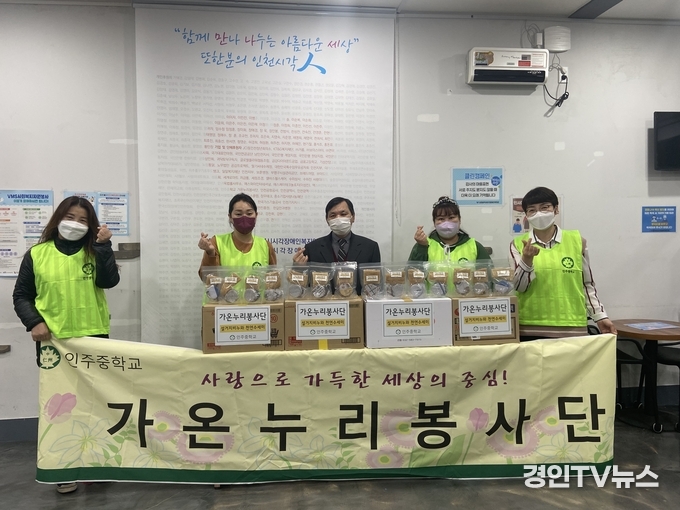 [ 경인TV뉴스 김선근 기자 ] 인주중학교 가온누리봉사단(단장 최진희)은 11월 18일(목) 인천광역시시각장애인복지관(관장 이춘노)에 방문해 천연수세미와 설거지비누가 담긴 에코키트 160개를 전달했다.