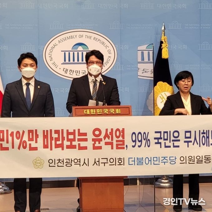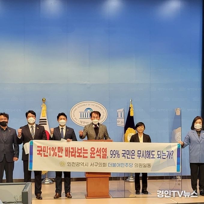 [ 경인TV뉴스 김선근 기자 ] 18일 오후, 인천광역시 서구의회 더불어민주당 소속 강남규, 심우창, 이순학, 정영신, 정인갑, 정진식, 최은순 의원은 국회 정론관에서 종합부동산세, 일명 ‘종부세’를 전면 재검토하겠다는 국민의힘 윤석열 후보를 규탄하는 기자회견을 열었다.