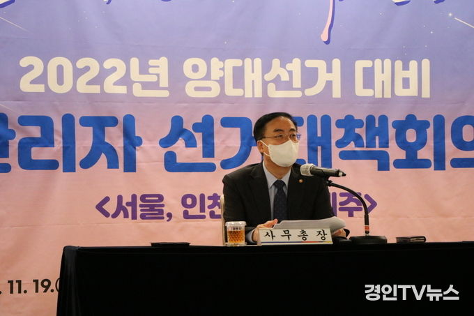 [ 경인TV뉴스 김선근 기자 ] 인천시선거관리위원회는 11월 19일 서울,인천,경기,제주 4개 시․도선관위 사무국․과장 이상 관리자를 대상으로 다가오는 제20대 대통령선거와 제8회 전국동시지방선거의 공정한 관리를 위한 선거대책회의를 송도컨벤시아(연수구 소재)에서 개최했다고 밝혔다.