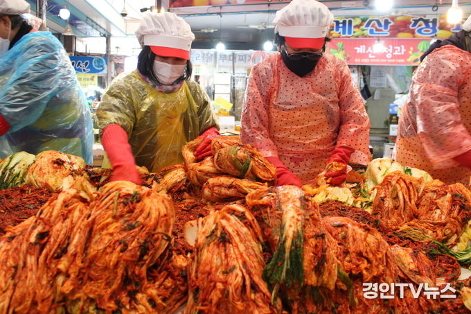 [ 경인TV뉴스 김선근 기자 ] 대한적십자사 인천지사(회장 김창남)는 대한적십자사 봉사회 계양지구협의회(회장 강순희)가 11월 18일(목) 인천광역시 계산구 계산시장에서 열린 ‘전통시장 가는 날-김장 대잔치’행사에서 취약계층 지원을 위한 사랑의 김장나눔행사를 진행하였다고 밝혔다.
