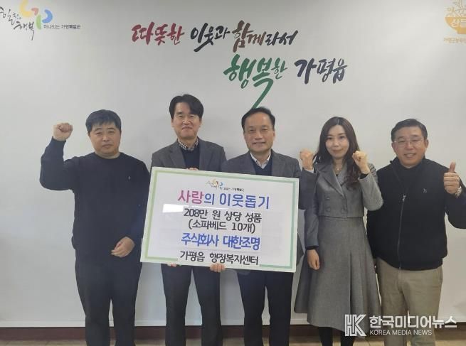 [ 한국미디어뉴스 김서안 기자 ] ㈜대한조명은 최근 가평읍 행정복지센터를 방문해 208만원 상당의 소파베드 10개를 기탁했다.