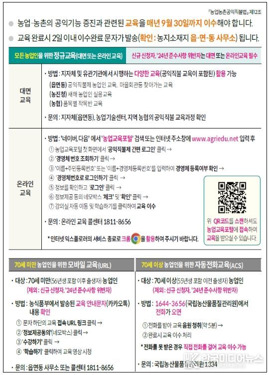 또한 시간과 장소에 구애받지 않고 교육을 받을 수 있도록, ‘농업교육포털’을 통해 온라인 교육도 제공된다. 스마트폰을 이용해 교육 영상을 시청할 수 있으며, 70세 이상 고령 농업인은 자동전화교육을 통해 음성으로 교육 내용을 들을 수 있다.