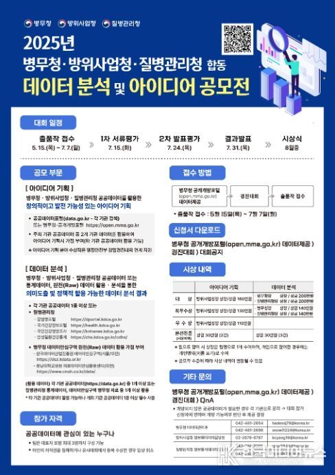 [ 한국미디어뉴스 권경민 기자 ] 병무청은 방위사업청, 질병관리청과 함께 공공데이터를 활용한 데이터 분석과 아이디어 공모전을 통한 혁신적 공공서비스 발굴을 위해 '2025년 병무청·방위사업청·질병관리청 합동 데이터 분석 및 아이디어 공모전'을 개최한다.
