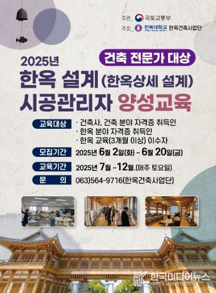[ 한국미디어뉴스 권경민 기자 ] 국토교통부는 6월 2일부터 한옥 설계·시공관리자 교육과정 수강생을 모집한다.
