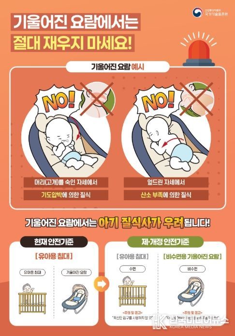 [ 한국미디어뉴스 권경민 기자 ] 산업통상자원부 국가기술표준원은 ‘비수면용 기울어진 요람’안전기준을 제정하여 ‘유아용 침대’의 일부로 존재하던 ‘기울어진 요람’을 비수면용 제품으로 명확히 구분한다고 밝혔다. 아울러, ‘비수면용 기울어진 요람’에 ‘수면용으로 제작된 것이 아님’을, ‘유아용 침대’에 ‘푹신한 침구를 사용하지 말 것’을 명확히 표시하도록 했다.