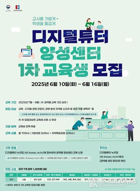 [ 한국미디어뉴스 권경민 기자 ] 교육부와 한국과학창의재단(이사장 정우성)은 6월 10일부터 전국 7개 권역 디지털튜터 양성센터에서 교육생 약 1,000명을 모집한다.