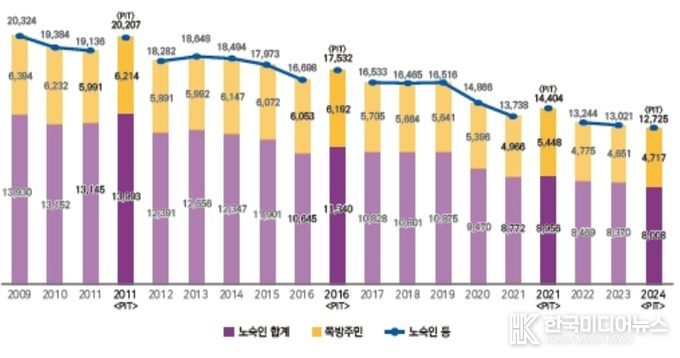 2024년도 노숙인 등의 실태조사 주요 결과는 2024년 전국 노숙인 등 수는 12,725명으로 2021년 대비 1,679명(△11.6%) 감소했다.
