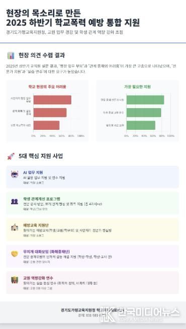 특히, 올해 하반기에는 AI활용 업무 지원을 통해 보고서 작성, 법규 검색 등 학교폭력 책임교사의 업무를 효율화하고, 전문 강사가 직접 학교로 찾아가 학생 및 교원의 관계 개선과 갈등 조정 역량을 강화하는 실습 중심의 프로그램을 확대 운영한다. 각급 학교는 필요한 사업을 하반기 동안 상시 신청하여 맞춤형 지원을 받을 수 있다.