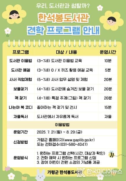 [ 한국미디어뉴스 김서안 기자 ] 가평군 한석봉도서관이 유아들의 도서관 친화적 문화를 조성하기 위해 어린이집 대상 ‘도서관 견학 프로그램’을 이달 21일부터 운영한다.