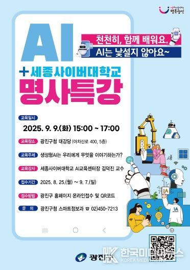 이번 특강은 선착순 400명까지 무료 참여로 진행되며, 신청은 9월 7일(일)까지 광진구청 누리집 온라인 신청 또는 홍보물의 큐알코드(QR Code)를 통해 가능하다. 자세한 사항은 광진구청 스마트정보과로 문의하면 된다.