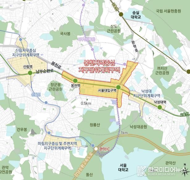 [ 한국미디어뉴스 이보영 기자 ] 관악구가 서울대입구역에서 봉천역에 이르는 강감찬대로 일대 약 59만 3천㎡에 대한 ‘봉천지역중심 지구단위계획(안)’을 마련해, 민간개발 활성화에 기대를 모으고 있다.