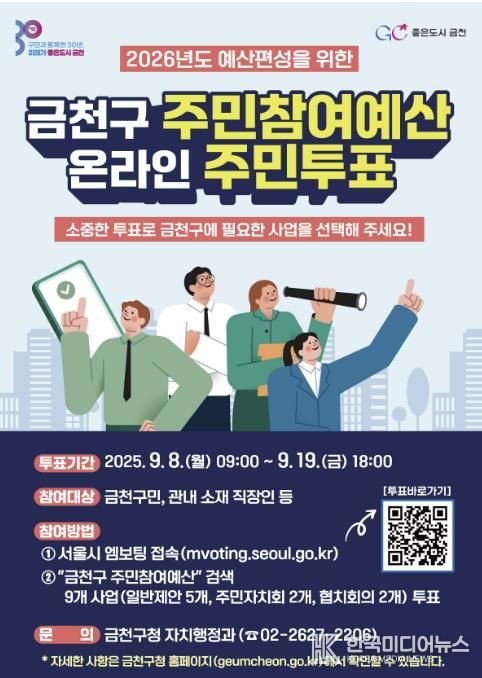 [ 한국미디어뉴스 이보영 기자 ] 금천구는 9월 8일부터 9월 19일까지 ‘2026년도 금천구 주민참여예산사업’ 선정을 위한 온라인 주민투표를 실시한다고 밝혔다.
