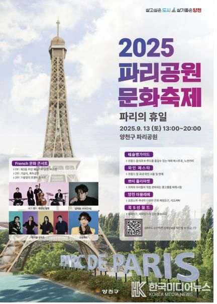[ 한국미디어뉴스 이보영 기자 ] 양천구는 오는 13일 파리공원에서 프랑스 음식, 음악, 놀이 등 문화를 체험하며, 파리의 감성을 느낄 수 있는 ‘2025 파리공원 문화축제’를 개최한다고 밝혔다.