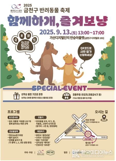 [ 한국미디어뉴스 이보영 기자 ] 금천구는 9월 13일 오후 1시 가산G밸리 만승아울렛(금천구 디지털로 193)에서 2025년 반려동물 축제 ‘함께하개, 즐겨보냥’을 개최한다고 밝혔다.