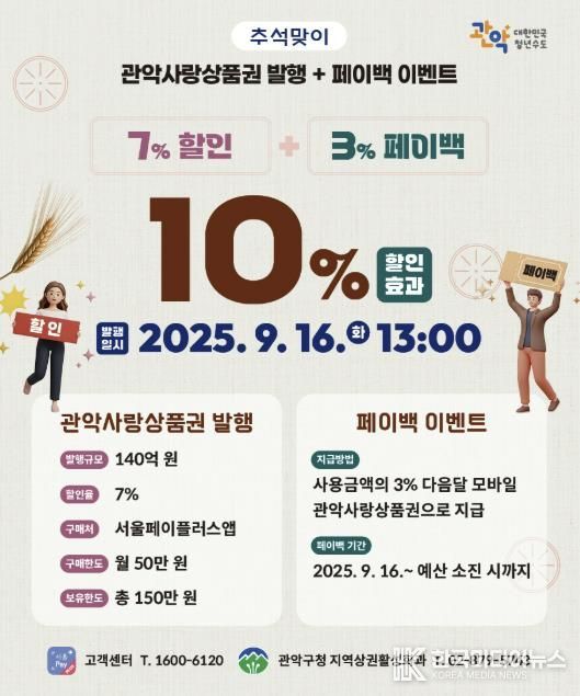 [ 한국미디어뉴스 이보영 기자 ] 관악구가 다음 달 긴 추석 연휴를 앞두고 오는 16일 오후 1시부터 140억 원 규모의 관악사랑상품권을 발행한다.