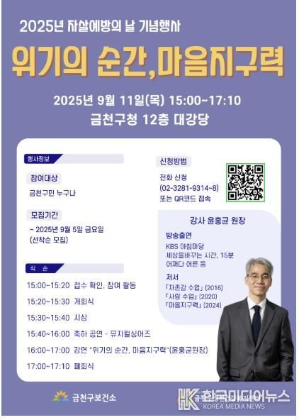 [ 한국미디어뉴스 이보영 기자 ] 금천구는 10일 세계 자살예방의 날을 기념해 11일 오후 구청사 12층 대강당에서 기념행사를 개최한다고 밝혔다.