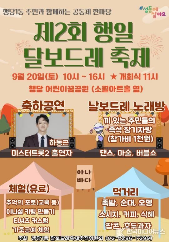[ 한국미디어뉴스 이보영 기자 ] 서울 성동구 행당제1동은 오는 20일 행당 어린이꿈공원에서 ‘제2회 행일 달보드레 축제’를 개최한다고 밝혔다.