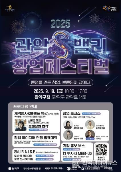 [ 한국미디어뉴스 이보영 기자 ] 관악구가 오는 19일 ‘2025 관악S밸리 창업페스티벌’을 개최, 벤처기업과 투자자, 청년이 함께하는 아이디어와 기술 교류의 장을 연다.