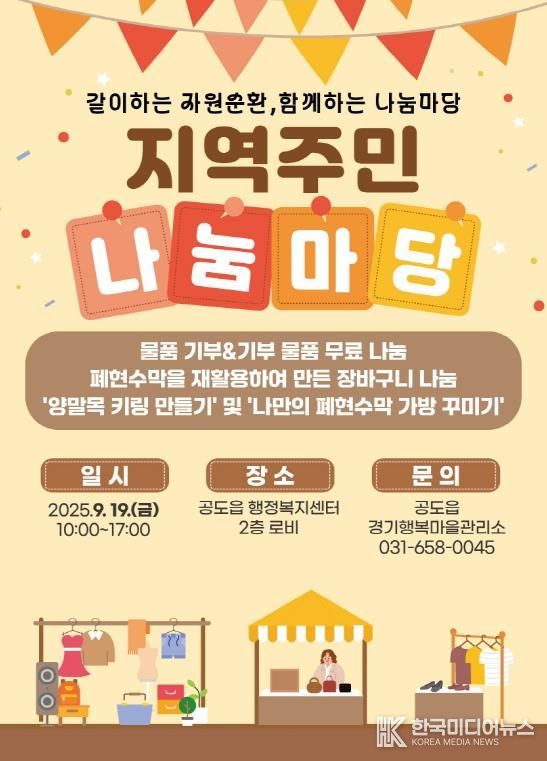 [ 한국미디어뉴스 이보영 기자 ] 공도읍 경기행복마을관리소는 오는 9월 19일 오전 10시부터 오후 5시까지 공도읍 행정복지센터 2층 로비에서 ‘지역주민 나눔마당’을 개최한다.