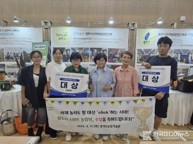 [ 한국미디어뉴스 김서안 기자 ] 양주시는 지난 11일 경기도농업기술원에서 열린 ‘2025년 경기도 농업인 스마트경영 혁신대회’에 참가한 양주시사이버농업인연구회가 스마트콘텐츠(고령) 분야와 스마트경영(개인) 분야에서 각각 대상을 수상했다고 밝혔다.