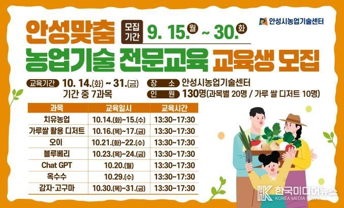 [ 한국미디어뉴스 이보영 기자 ] 안성시농업기술센터는 오는 9월 15일부터 30일까지 안성맞춤 농업기술 전문교육 교육생을 모집한다고 밝혔다.