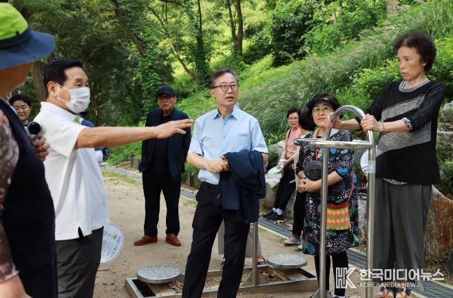 반가워하던 주민들은 곧이어 유 구청장에게 어려움을 꺼내놓았다. 이 근방에 산다는 황충관(80) 씨는 “이곳에서 매일 30~40명이 정기적으로 운동을 한다”며 “다만 지붕이 없어 비가 올 때는 어쩔 수 없이 운동을 쉬어간다”고 아쉬움을 토로했다. 시흥2동 주민인 이연옥(67) 씨 역시 “안전하게 운동을 하고 싶다”며 “일부 빗물에 흙이 떠내려가 바닥이 패인 곳도 있다”고 설명했다.