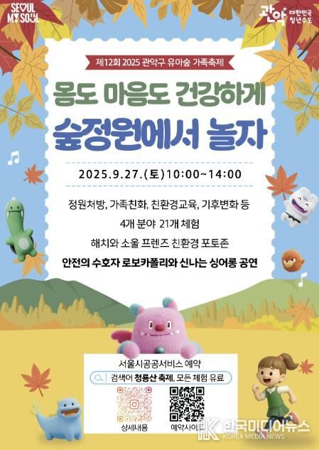 [ 한국미디어뉴스 이보영 기자 ] 관악구가 오는 27일 오전 10시부터 오후 2시까지 청룡산 유아숲체험원에서 ‘2025년 제12회 유아숲 가족 축제’를 개최한다.