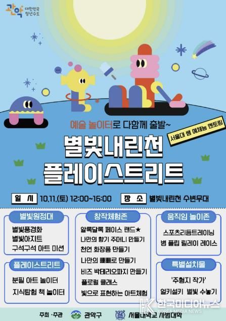 [ 한국미디어뉴스 이보영 기자 ] 관악구가 오는 10월 11일 별빛내린천 수변무대 일대에서 개최하는 ‘예술놀이터 : 별빛내린천 플레이스트리트(PlayStreet)’에 참여할 별빛원정대를 모집한다.