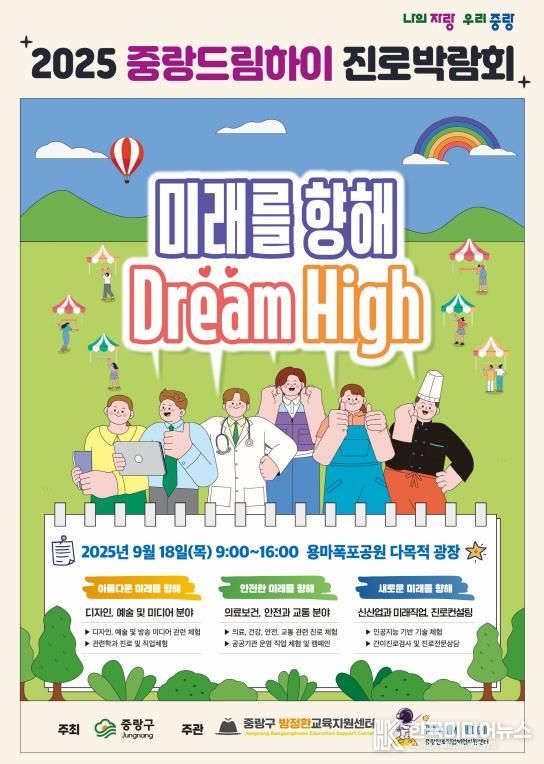 [ 한국미디어뉴스 이보영 기자 ] 중랑구는 9월 18일 오전 9시부터 오후 4시까지 용마폭포공원 다목적광장에서 ‘2025 중랑드림하이 진로박람회’를 개최한다. 이번 행사는 중랑구가 주최하고 중랑구 방정환교육지원센터와 중랑진로직업체험지원센터가 공동 주관하며, 관내 중학생 2,000여 명과 학부모, 교원, 지역사회 관계자들이 참여한다.