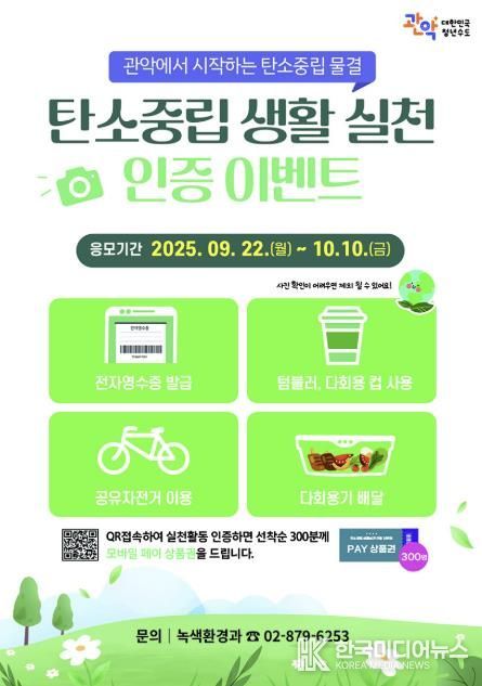 [ 한국미디어뉴스 이보영 기자 ] 관악구가 기후위기 대응과 탄소중립 실천 문화 확산을 위해 ‘탄소중립 녹색생활 실천 인증 이벤트’를 진행한다.