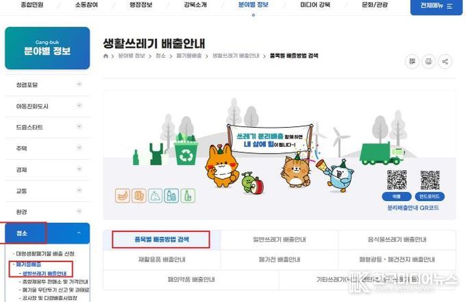 [ 한국미디어뉴스 이보영 기자 ] 서울 강북구는 생활폐기물의 올바른 분리배출을 돕기 위해 구청 홈페이지에 ‘청소’ 메뉴를 신설하고, 주민 맞춤형 폐기물 분리배출 안내시스템을 운영한다고 밝혔다. 주요 기능은 품목별 검색으로, 9월 시범운영을 거쳐 10월부터 정식 운영에 들어간다.