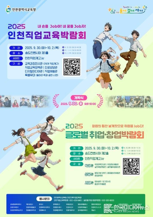 [ 한국미디어뉴스 이원영 기자 ] 인천광역시교육청은 9월 30일부터 10월 2일까지 3일간 송도컨벤시아에서 ‘2025 인천직업교육박람회’와 ‘2025 글로벌 취업·창업박람회’를 동시 개최한다고 19일 밝혔다.