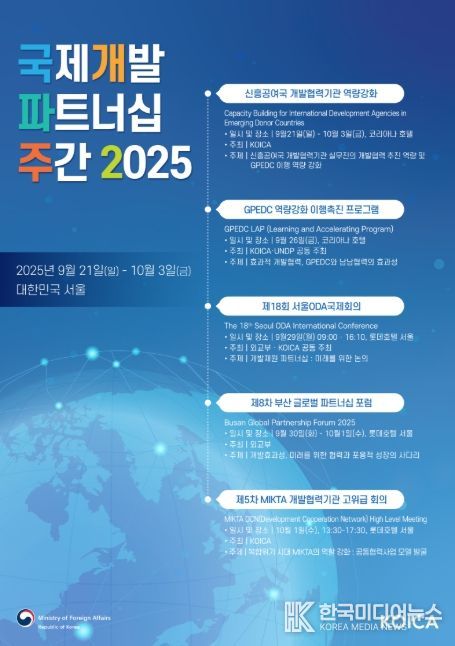 [ 한국미디어뉴스 이원영 기자 ] 외교부는 9월 21일~10월 3일 간 서울에서 한국국제협력단(KOICA)과 공동으로 '2025 국제개발 파트너십 주간'을 개최한다.