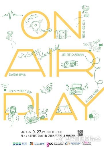 [ 한국미디어뉴스 이보영 기자 ] 안성미디어센터가 시민 라디오 공개방송 'ON AIR PLAY'를 9월 27일 13시부터 스타필드 안성 1층 고메스트리트 내 특별무대에서 개최한다고 밝혔다.