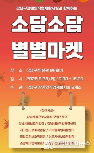 [ 한국미디어뉴스 이보영 기자 ] 꿈이 모이는 도시, 미래를 그리는 강남구가 9월 23일 오전 10시부터 오후 4시까지 구청 본관 1층에서 장애인생산품 특별판매·홍보전 ‘소담소담 별별마켓’을 개최한다.