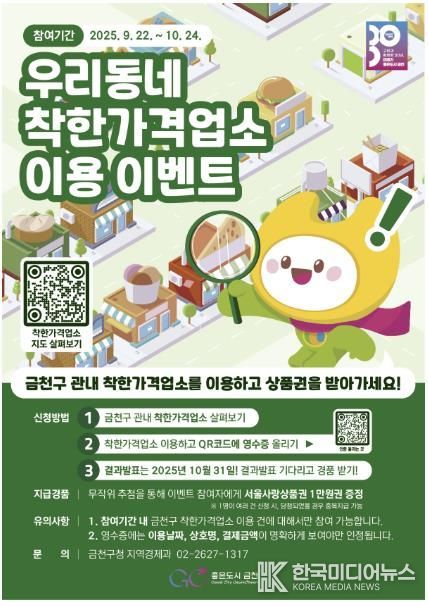 유성훈 금천구청장은 “착한가격업소는 물가 안정과 지역경제 활성화에 기여하고 있다”라며 “이번 이벤트를 통해 주민들이 착한가격업소를 더 많이 알게 되고, 직접 이용하는 계기가 되길 바란다”고 전했다.