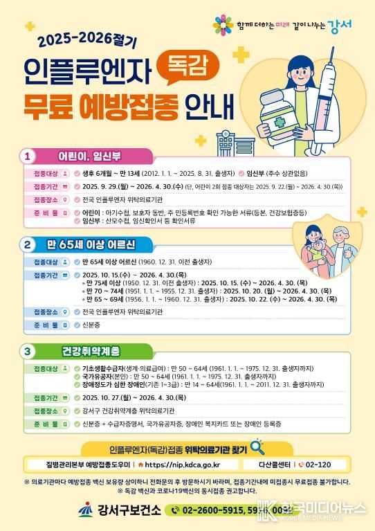 [ 한국미디어뉴스 이보영 기자 ] 서울 강서구가 오는 9월 22일부터 내년 4월 30일까지 인플루엔자 백신 무료 예방접종을 실시한다고 밝혔다.