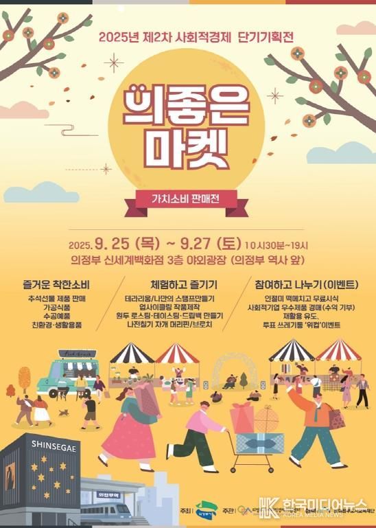 [ 한국미디어뉴스 김서안 기자 ] 의정부시는 9월 25일부터 27일까지 3일간 신세계백화점 의정부점 야외광장 3층에서 2025년 제2차 사회적경제 단기기획전 ‘의좋은마켓’을 개최해 사회적경제기업의 판로 확대와 지역경제 활성화에 나선다.